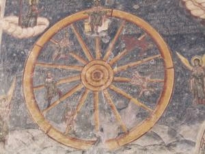 En el fresco más inusual, denominado ‘La rueda del mundo’, se puede apreciar la rotación de la Tierra alrededor del Sol, dentro del cual se aprecia un triángulo equilátero con “el ojo que todo lo ve” que envía rayos solares hacia la Tierra, informa el diario local ‘News Brasov‘.